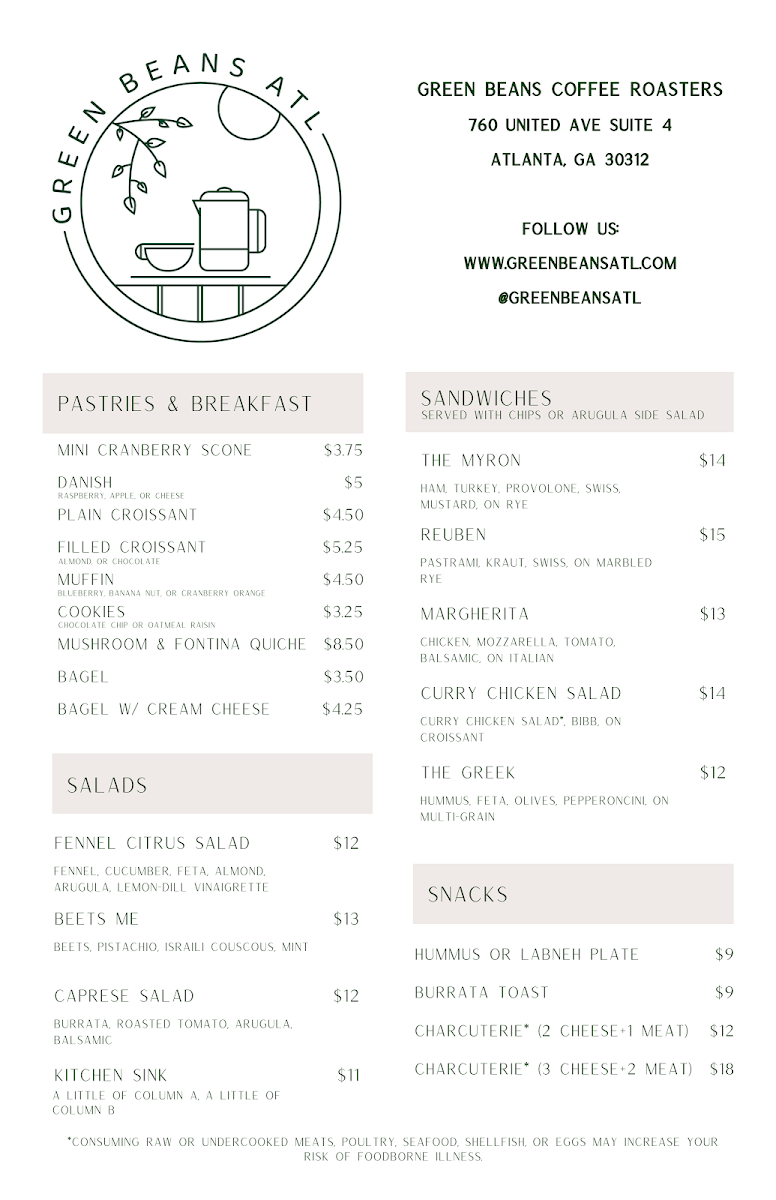 Introducing the menu at Green Beans ATL, a gem nestled in Atlanta’s Grant Park neighborhood, you’ll find a delightful array of beverages that cater to every taste. Their espresso offerings include a rich Cortado and a classic Macchiato, alongside a variety of aromatic teas like the comforting Chai Latte and the refreshing Yuzu Peach. Green Beans ATL delights in everything fresh, offering unique house-made syrups and mouthwatering pastries that make each visit a treat.